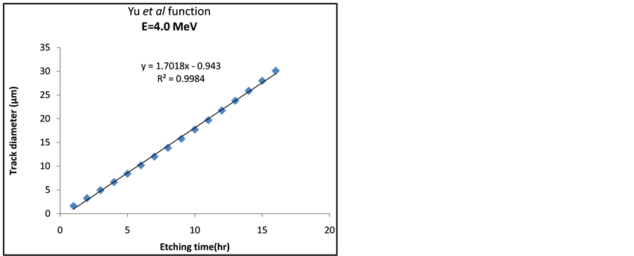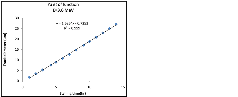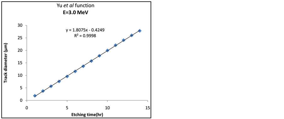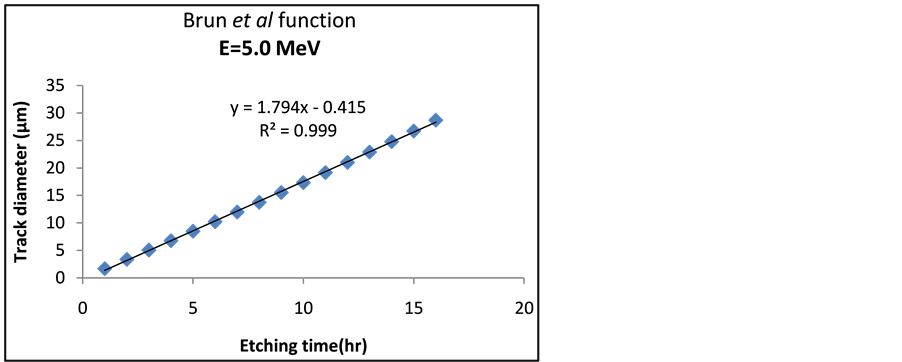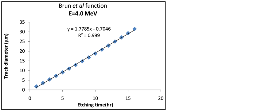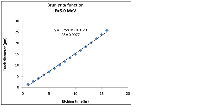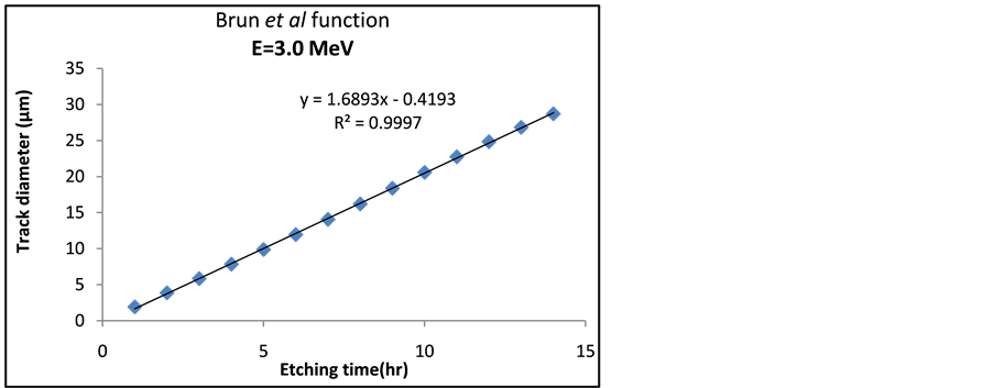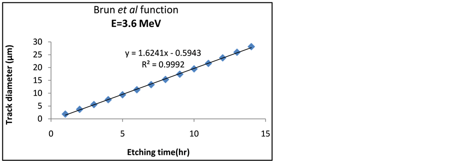 The values of the tracks diameters of alpha particles in CR-39 detector and the etching time have been found by using TRACK_TEST program [11] from Yu et al. function [12] and from Brun et al. function [13] for the same energies of alpha particles (3.0, 3.6, 4.0 and 5.0) MeV for the two functions.