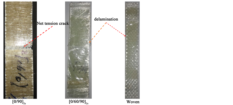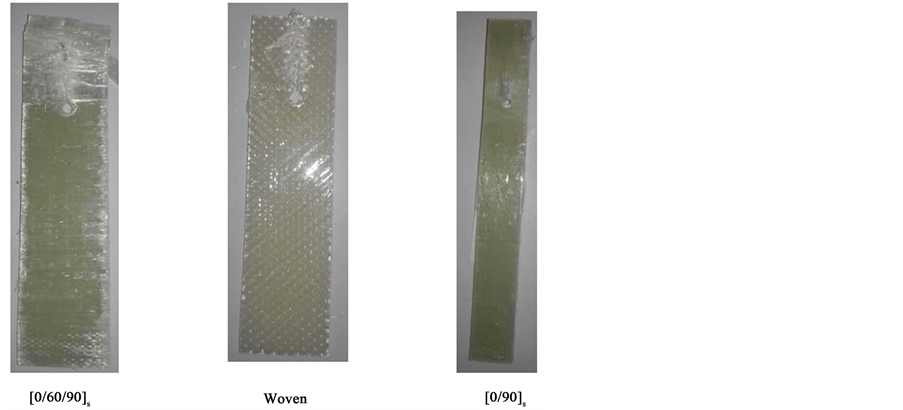 Figure 10 shows the images of (a) [0/60/90]s panels and (b) woven specimens after applied Center cracked test. It is observed that delamination occurs in [0/60/90]s panel’s core of composite. The delamination occurs probably; due to that weaken of epoxy resin adhesive used in manufacturing the laminates panel and there was net tension in laminates panel’s specimens.