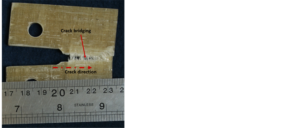 Figure 8 shows the images of [0/90]2s panels specimens after applied compact tension test. Crack length (a) in the [0/90]2s panels was observed on the surface and there is fiber bridging in laminates facings onto [0/90]2s panels core specimen but fiber of cross ply laminates panels is very weak so that observed from Figure 8 and results in Table 3, that laminates facings give the cross-ply panels higher fracture properties.
