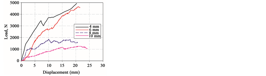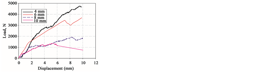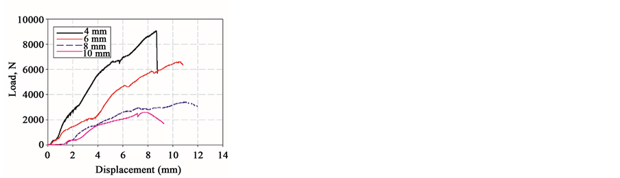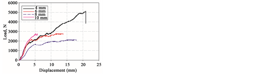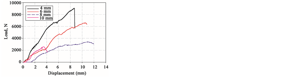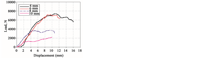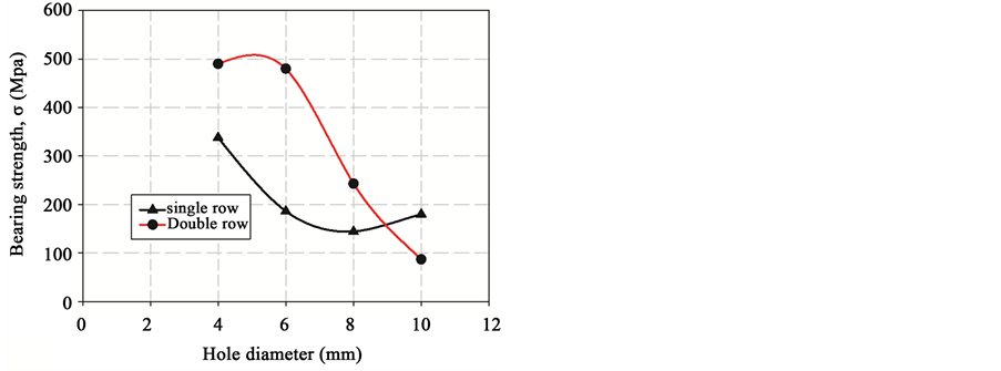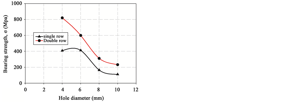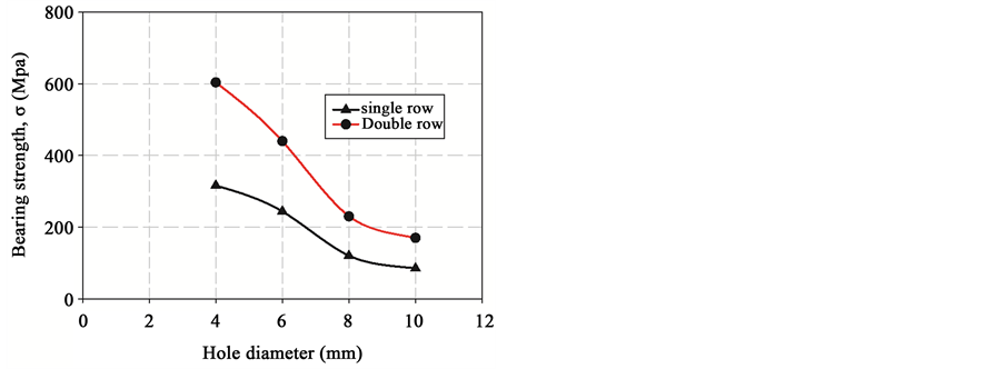 Load displacement relation for bearing strength test for both single row and double row lab joints are illustrated in Figures 11-13. It is clearly observed that as the rows of bearing increase the load increase; this can be attributed to in- creasing of material strength facing each bolt. While, it is shown that with increasing bearing diameters the load decreases, this is due to increasing of size effect and nosh sensitivity with increasing stress intensity factor Ks around these holes [2] [17] [19] [20] . Bearing strengths of the lab joint with double rows are