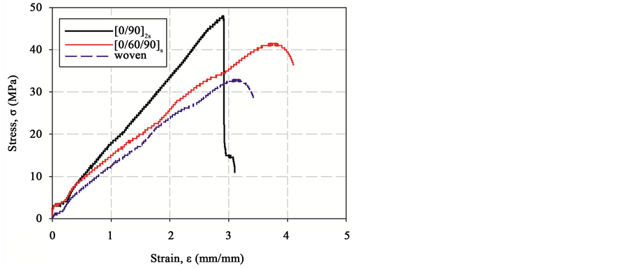 Figure 9 shows stress strain curves results for Center cracked test on [0/60/90] panels and woven epoxy panel, observed that curves o Five specimens were used