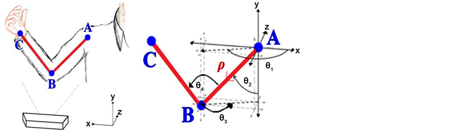 On the left side of Figure 3 is illustrated where the Kinect is tracking a user’s both arms. Points A, B and C represent the tracked shoulder, elbow and wrist joints respectively. As it can be seen on the right side of Figure 3, the joints A and B have been treated as “start” and “end” points respectively which have now formed a vector