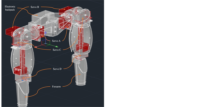 The humanoid robotic arm was designed to have four degrees of freedom from shoulder up to and including the forearm for each arms. Each degree of freedom has been represented an angle of movement that can be performed by the human arm. A servo motor has been used to implement each angle of movement (θ1→θ4). As the shoulder joint feature 3D motion and elbow joint feature 1D motion, pan and tilt mechanisms [7] have been implemented so as to allow servo motors at each joint to perform the required motion. The arm’s bones have been summed to two parts, the upper arm (shoulder to elbow) and the lower arm (elbow to wrist). As it can be seen in the complete humanoid robotic arm design Figure 4. The upper and lower arm parts have been represented and printing by using 3D printer. So as to represent the human body, a rectangular chest shape (center pillar) has been used to elevate the arm to a height of 460 mm from its base. The chest had been design so that Servo A can fitted exactly in the hole inside the chest indicating the first joint, the shoulder. All servo motors have been fitted to the plastic parts by using bolts and nuts to allow future modifications while maintaining consistency through the structure. Finally overall system was implement as shown in Figure 5.