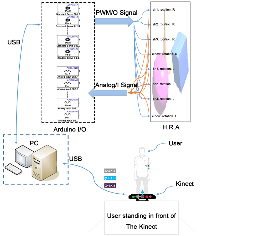 In the experiment, the operator stand in front of the Kinect to control the robotic arm. After the angles been calculated by invers kinematics algorithm the data are send by USB cable to the robot through an Arduino interface microcontroller and measure values can be taken from potentiometer sensor build inside the servo motors.