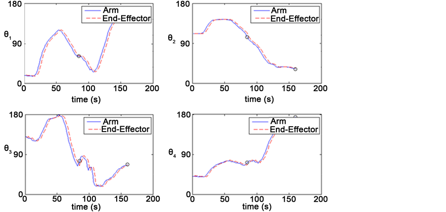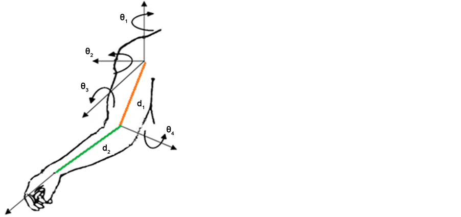 Consider the human arm shown in Figure 2 are modeled as a total 4-DOF, which the shoulder joint is repre- sented by three intersecting revolute joint and elbow joint is represented by one revolute joints. From the D-H parameters it can get the four transformation matrices which transfer the movement from joint to another and