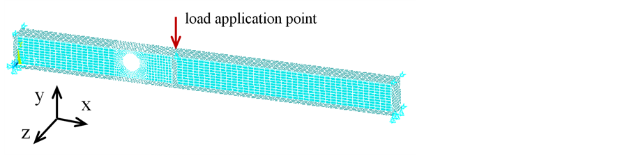 During the numerical investigation it was necessary to ensure that the model collapse was not associated to lateral torsional buckling or to a local buckling at the load application point or supports. This was made by re- stricting the lateral displacements of the top flange along the beam span and using transverse stiffeners at the load application point and supports. Figure 5 and Figure 6, present the models developed by Chung et al. [10] and Chung and Lawson [2] to simulate the steel beam with a single web opening.