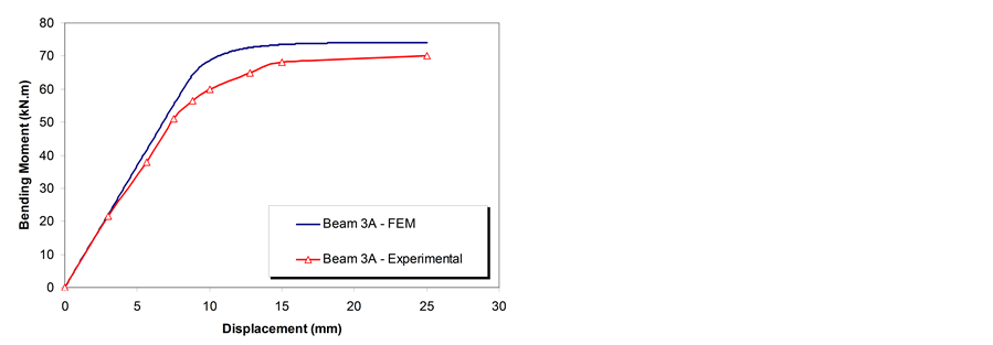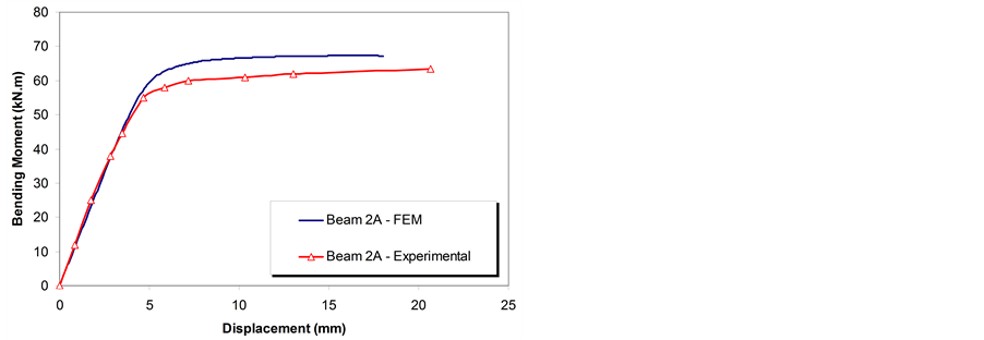 The calibration of the developed models was also made through comparative graphs containing the experi- mental results produced by Redwood and McCutcheon [24] . Figure 12 and Figure 13 depict bending moment at the centre of the web opening versus central span vertical deflection curves for beams 2A and 3A. The curves indicated that a reasonable agreement with the experiments was reached specially in the elastic range. On the plastic range a slight difference between the numerical and experimental results was observed. This difference can be attributed to the 5% strain hardening Young modulus adopted in the numerical models. Another reason could be related to the residual stresses induced by the welding/rolling processes or geometric that was not in- corporated in the numerical models. Geometric imperfections present in these beams can also be the cause for this difference. Table 4 presents a comparison of the experimental and numerical results for Beams 2A and 3A.
