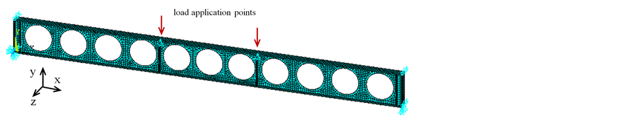 The developed finite element models are similar to the models developed by Chung et al. [10] . The mesh was refined near the web opening to enable the model to accurately represent the effect related to the stress concen- tration, the onset of plasticity in the web and flanges as well as the hinge formation that characterises the Vier- endeel collapse mechanism. The beams supports were created aiming to reproduce simply support conditions. The boundary conditions used for this issue can be identified in Figure 7 and Figure 8, i.e., on the bottom left side, restrictions to displacements UX, UY and UZ and on the bottom right side, restrictions to displacements UY and UZ. The lateral bracing supports were used along the beam top flange to inhibit the lateral torsional buckling with restrictions to UZ displacements... The load application point as well as the transverse stiffeners used to avoid the local web buckling can also be clearly identified in Figure 7 and Figure 8, respectively.