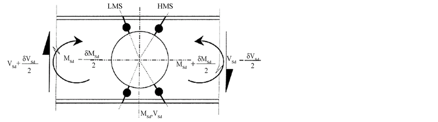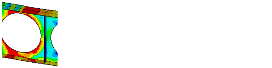 Steel beams with web openings are frequently governed by Vierendeel collapse mechanism that occurs due to a change rate in the bending moment distribution (and consequently, the shear force) along the opening [22] . This bending moment increase is usually resisted by upper and lower “Tees” through their respective local bending strengths, Figure 2 [22] . The “Tees” local bending resistance can be improved by using horizontal stif- feners welded above and below the web openings. This is even more relevant for the cases where fatigue is a controlling factor.