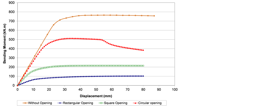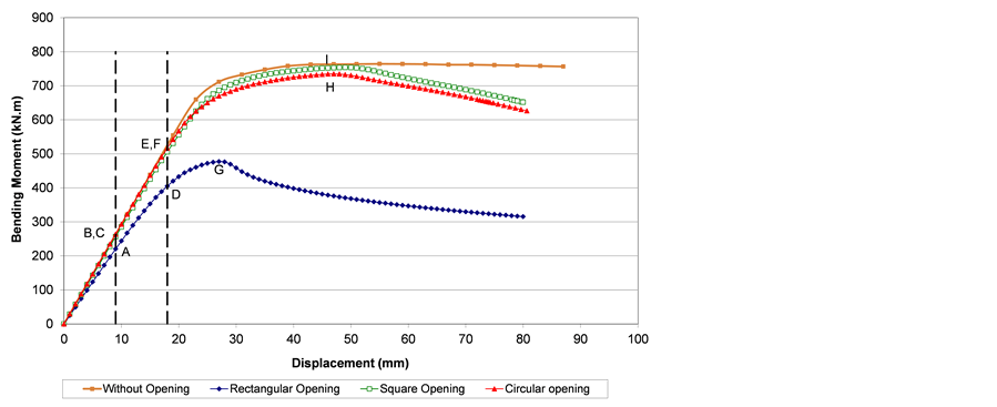 Figure 16 presents the variation of the bending moment at the web opening centre versus the load application point vertical displacement for specimens A, 1, 3 and 5, Table 6. From this figure it is possible to conclude that the higher ultimate moment is associated to the beam with a square opening closely followed by the beam with circular opening. On the other hand, a 35% reduction on the ultimate moment capacity was observed in the beam with a rectangular opening. The beams with square and circular openings presented a similar structural response and had their collapses associated to an interaction of the Vierendeel mechanism and the load application point bending collapses. Alternatively, the beam with a rectangular opening depicted a typical Vierendeel collapse mechanism illustrated by abrupt failure without the presence of a yield plateau.