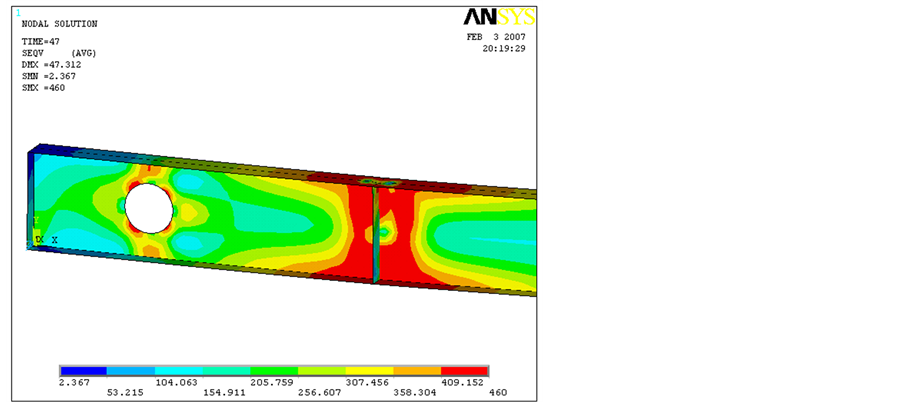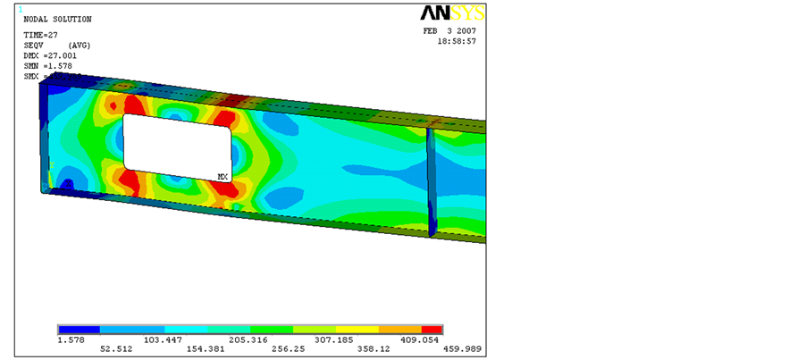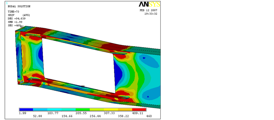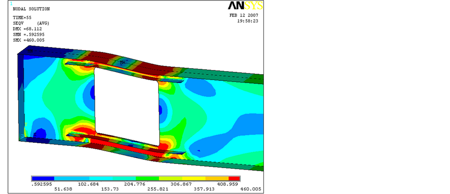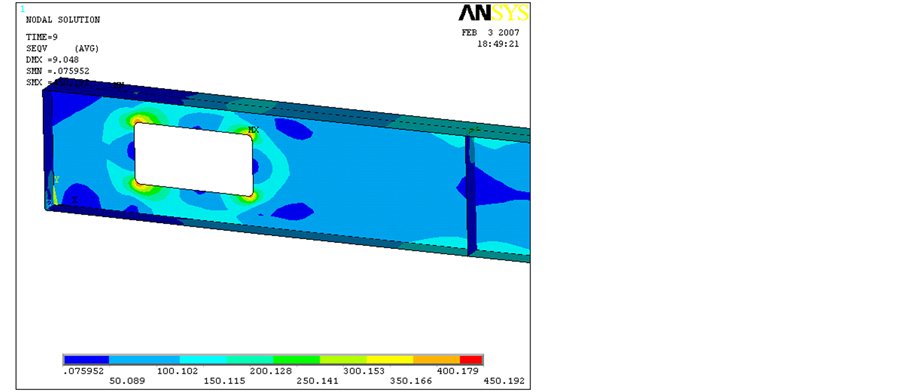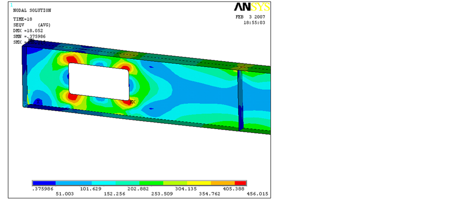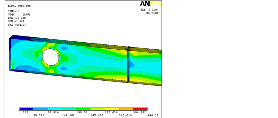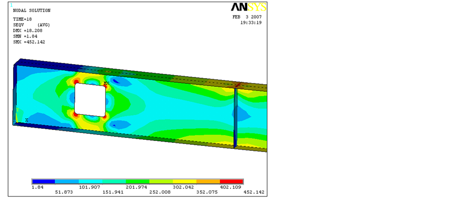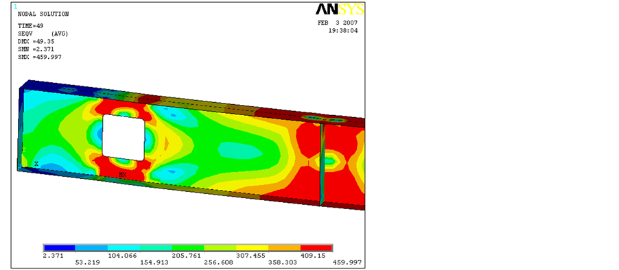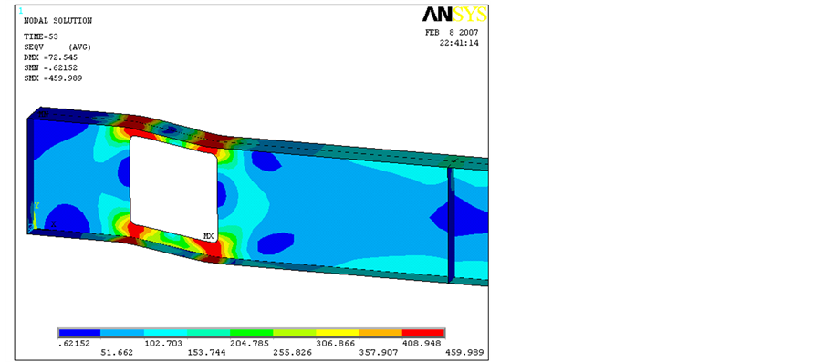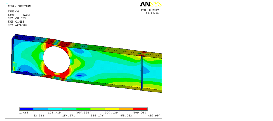 Figure 11. Beam 2A von Mises stress distribution at the perforated section (in MPa).