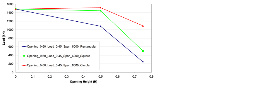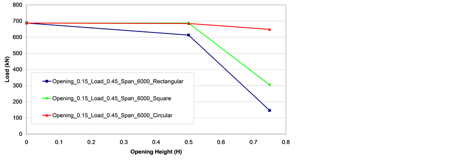 Figure 24 and Figure 25 present ultimate load versus the opening to web height ratio curves for the IPE750x137 steel profile. From these graphs it is possible to observe that, for a six meter span and a web opening equal to 0.5 H, the beams with circular and square opening geometries presented almost similar ultimate loads to the beam without openings. On the other hand, the beam with a rectangular opening, a six meter span and a web opening equal to 0.5 H, showed a significant reduction on its load carrying capacity. The reduction in load carrying capacity was even more pronounced for all the beams with a six meter span and a web opening equal to 0.75 H (H is the opening height). Beams with a ten meter span one more time proved the structural efficiency of the beams with circular openings presenting higher ultimate loads than the other investigated opening geometries.