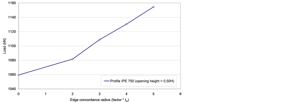 It can be easily observed that an increase of opening edge concordance radius was very efficient for increas- ing the collapse loads beam with rectangular openings. An IPE500 with a rectangular opening height equal to 0.5 H, a six meter span and an opening edge concordance radius equal to five times the web thickness, presented a 9% increase of its ultimate load when compared to beams with smaller concordance radius, Figure 26. This fact serves to corroborate the importance of this structural detail in the web stress redistribution of beams with web openings.