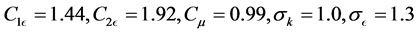 The turbulent kinetic energy and its rate of dissipation are obtained from the following transport equations: