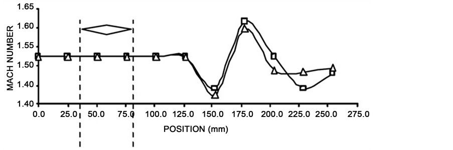 Figure 9. Comparison of Mach numbers obtained experimentally and numerically in supersonic flow.