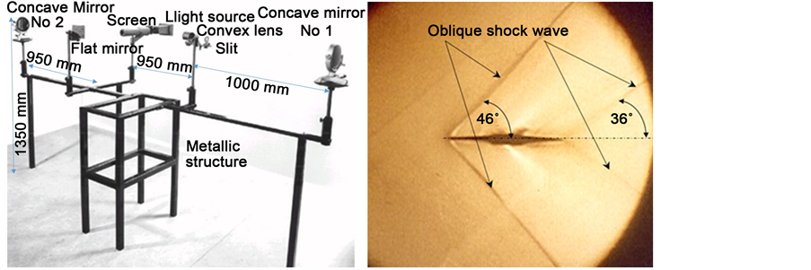 The Schlieren method consists in emitting a ray of light from the light source of 12 volts, this ray passes through a convex mirror and then by a slit, that strikes the concave mirror No. 1. After that this light ray passes through the Schlieren window of the supersonic wind tunnel, where is located the double wedge profile and it is reflected into the concave mirror No. 2. Therefore the light ray is projected on a plane mirror, which is located in front of the screen where resulting image is projected, Figure 3(b). This phenomenon is a technique for projecting optical images due to the air refractive index. Schlieren systems are used to visualize the flow away from the surface of an object.