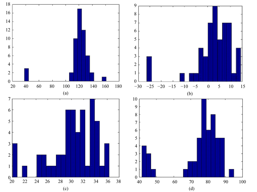Figure 1. Histograms of patient distribution by the obtained numerical attribute: values of weight coefficients obtained when using as the source data: (a) Before the treatment (initial) and changes in testing results (Δ, i.e. after minus before the treatment); (b) Changes (Δ) in testing results during the treatment, taking into account three “single-measured” tests; (c) Before the treatment (initial) testing results; (d) Before the treatment (initial) testing results with the risk group definition.