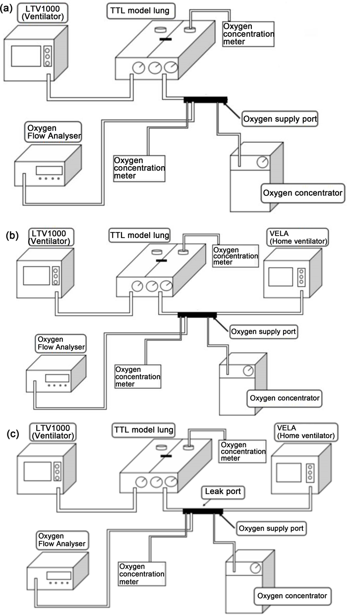 In order to simulate NPPV by VELA, oxygen was supplied from the oxygen concentrator to the lungs of the TTL model lung and at the same time a ventilator was attached. In addition, oxygen at concentrations ranging from 0.5 to 5 L/min was released from the adapter. From the summed-up value of the ventilation volume per minute from the respirator and the oxygen volume per minute in the oxygen concentrator, leaked at 5 L/min, the leak amount was precisely measured using the flow analyzer (PF-300, Ver. 3.1, imt Medical, Switzerland). From there, FiO2 was measured for 5 minutes in the TTL model lung part and Y piece part. Measurements were repeated 10 times for each setting.