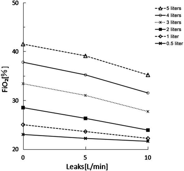 However, FiO2 decreased by 2.8% at 1 L/min O2 flow and 1.4% at 0.5 L/min O2 flow when the leakage was increased from 0 to 10 L/min. At low rates of O2 flow, FiO2 was minimally affected by the leakage (Table 1, Figure 3).