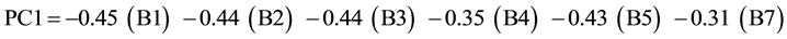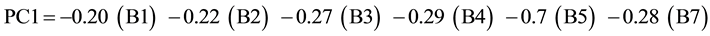 From the eigenvectors (Table 1 and Table 2), positive and negative loading in PC1 - PC7 was exploited for the appropriate choice of band ratio. In PC1, for example, we obtained Equation (17) for Landsat 7 ETM+, and Equation (18) for Landsat 8 OLI.