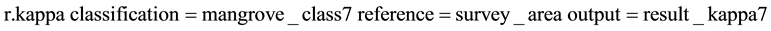 To generate a kappa value, we needed to import shapefile data of ground truth into GRASS GIS with “v.in.ogr” expression (Equation (20)), and thereafter convert again the vector to a raster with “v.to.rast” expression (Equation (21)). Then we employed “r.kappa” expression (Equation (22)) in GRASS GIS command console.