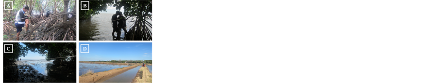 Figure 3. Ground truth and field work activity in the study area; (A), (B), (C) Measuring mangrove area; (D) Fishponds location (milkfish).