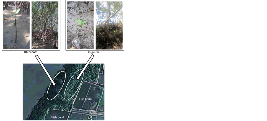 From the field work activity, we found that there are two types of mangrove trees that exist in the study area, Rhizophora and Bruguiera as shown in the following Figure 4.