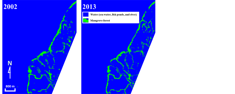 Figure 5. RGB colour composite of the study area for year 2002 and 2013. Deep blue coastal was loaded in the red channel, NDVI images in the green channel, and NDWI images in the blue channel.