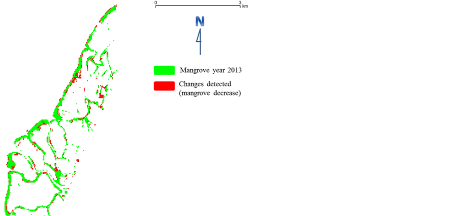 Figure 7. Detected changes in mangrove extents (2002-2013). The green color represents mangrove foliage cover for the year 2013, while red represents the changes detected over the 11 years period.