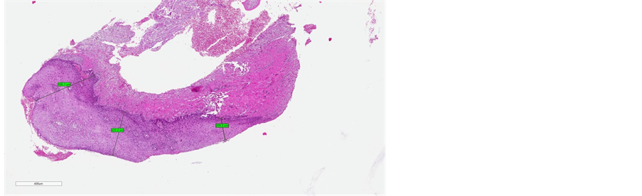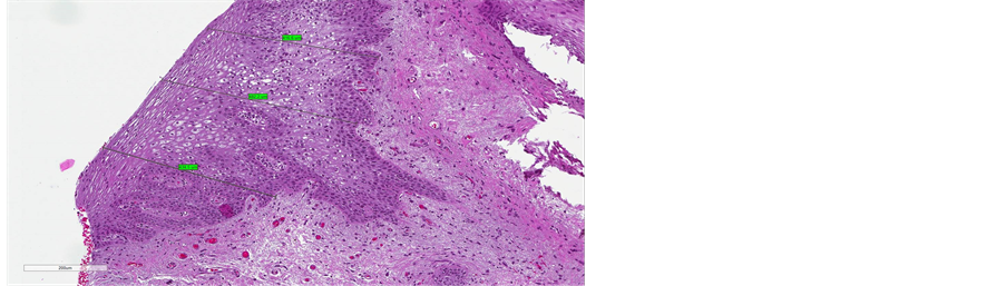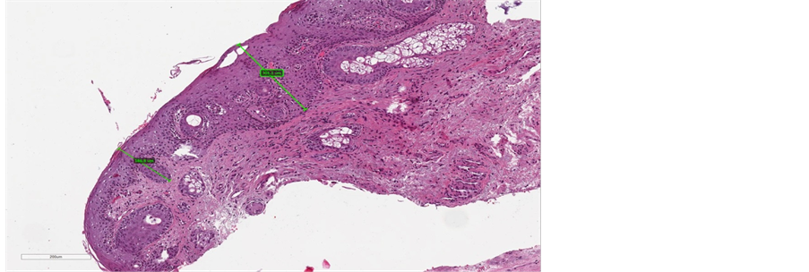 (Figure 4(b), Figure 5(b), Figure 6(b)). Immunostaining for collagen III and IV demonstrated a visible post-treatment enhancement. Microscopic examination of the biopsy sections revealed a striking increase in the thickness of epitelium, with resurfacing of the Malpighian layer and epithelial papillae. The median improvement from baseline in epithelium thickness was 97% (range: 9% - 203%).