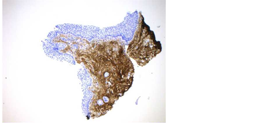 Figure 8. (a)-(b) Evaluation of type III collagen using monoclonal antibody. (a) Vaginal mucosa before treatment. (b) vaginal mucosa after treatment: significant increase in the thickness and staining of the epithelium.