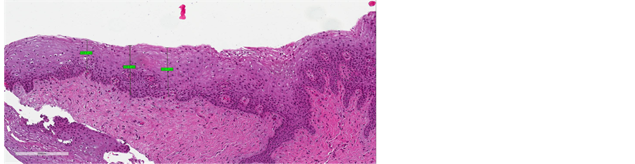 Figure 4. (a) pre-treatment section of epithelium (maximum measure of 300 µm); (b) post-treatment section of epithelium (maximum measure of 1133 µm).