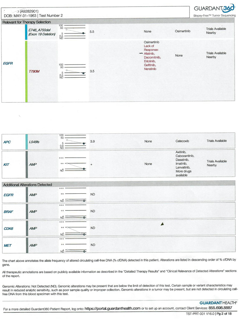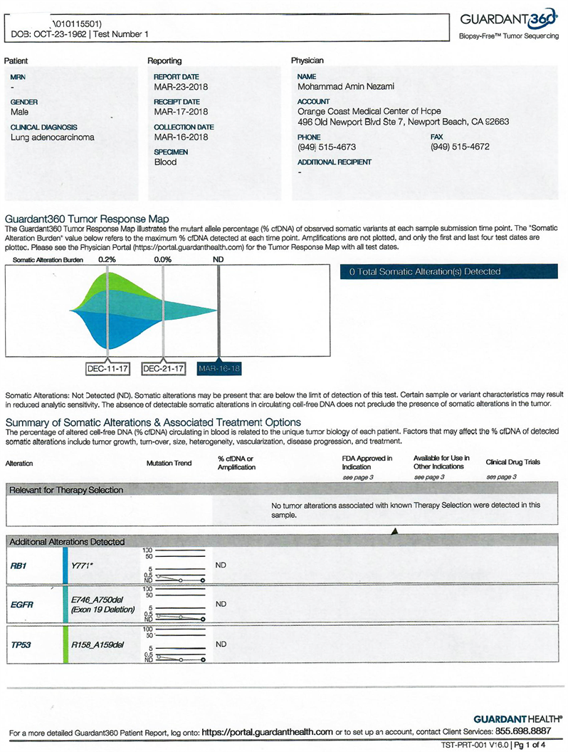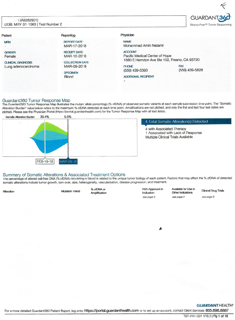 Our initial labs confirmed the presence of EGFR mutation at T790 M, as well as increased CYFRA 21.1 and IGF-1. Immediately she was started on IV epigenetic therapies per MTET protocol, which she received on daily basis for two weeks. Her labs further were repeated on March 9th, which showed reduction of her circulating DNA MAF (mutation allele fraction) from 31 percent down to 5 percent in her EGFR. (plus APC, Kit, BRAF, MET alteration reduced or disappeared). Her blood test also confirmed reduction of her ALK-P, CRP and LDH. (normalized) Her IGF-1 also normalized at 118 (on 3/9/18). See Figure 1.