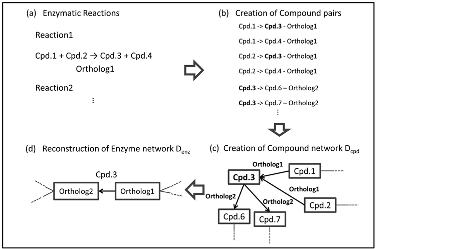 Many studies have revealed various aspects of metabolism and other cellular processes’ in numerous organisms. This metabolic knowledge has been accumulated in databases such as KEGG [10] -[12] , BioCyc [13] , Reactome [14] and others [15] [16] . These databases are useful for the identification of biological functions from the genome sequences. A metabolic pathway database typically contains information about the chemical transformations and the enzymes catalyzing each transformation, as a metabolic network [16] . This network is represented as a chemical network and a genomic network [17] . The chemical network depicts how compounds are transformed by continuous enzymatic reactions. The genomic network represents how the enzymes are connected by the compounds that they chemically transform. In the metabolic pathway databases, these networks represent pathway maps that are classified by various metabolic categories. The metabolic network usually describes the chemical transformations of the main compounds. In actual metabolism, by-products are produced by enzymatic reactions, in addition to the main products. Since a cell is a closed space, fluctuations in the levels of the by-products are considered to affect the other reactions in the cell. It is assumed that connections of the enzymes by the by-products also exist. Consequently, the comprehensive connections among enzymes are revealed by a pathway model that considers the chemical transformations of all of the compounds, including the main compounds and the by-products.