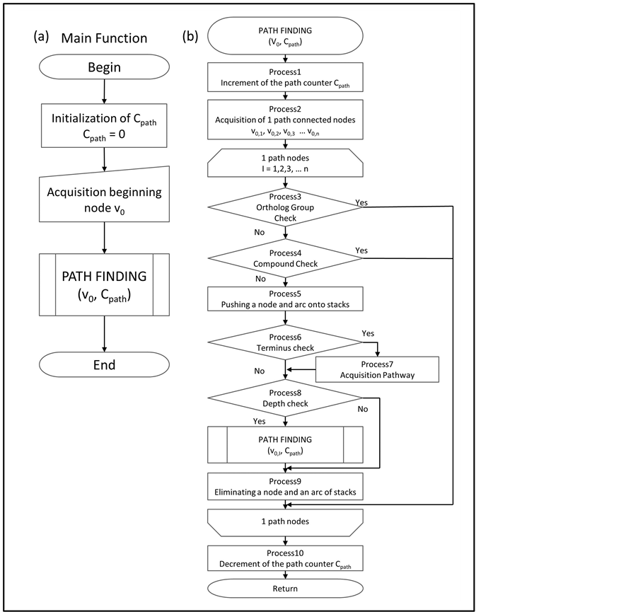 The possible interactions between the ortholog groups located within the constrained paths were explored comprehensively, by a path finding algorithm. The main function of the algorithm is as follows. First, a variable for the counting depth of exploration was initialized (Figure 2(a)). Next, a beginning node was obtained (Figure 2(a)). In this algorithm, the counter and the beginning node were defined as Cpath and v0, respectively. Finally, a defined function of PATH FINDING was employed (Figure 2(a)). This function explores nodes that are connected by one path from a provided node, and occurs recursively until the depth of exploration achieves fixed paths (Figure 2(b)). In this algorithm, Cmax is fixed as the maximum depth of path finding. The terms v0,1, v0,2, v0,3, … and v0,n stand for the nodes that are connected by one path from v0 (Figure 2(b)). The subscript number denotes the depth of exploration. For example, v0,1,2 is a node that is connected to v0 for two paths. The parents of v0,1,2 are v0 and v0,1. Spath is a stack that contains the nodes from v0 to the current node (Figure 2(b)). The v0 is accumulated on Spath as an initial value. The Scpd is a stack with the compounds corresponding to the arcs (Figure 2(b)). The compounds contained in Scpd connect the nodes from v0 to the current node. The initial value of Scpd is null. In Figure 2(b), Process1~Process10 are described as follows.