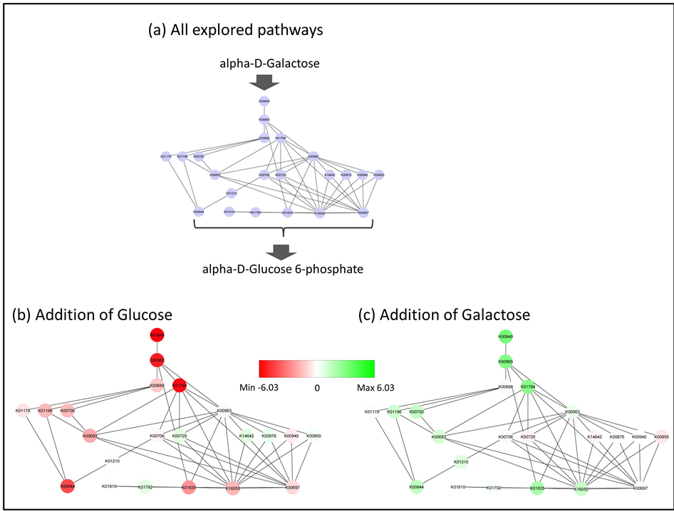 Figure 4. All pathways from α-D-galactose to α-D-glucose-6-phosphate. (a) All pathways explored from sCPM are shown. The ID labels in the nodes represent the ortholog group IDs in the KEGG database. The beginning node is K00849. The end nodes are K00844, K01810, K01792, K01835, K16055 and K00697. The merged pathways are shown. If nodes are connected by multiple arcs, then the arcs are shown as one arc; (b) Mapping of the gene expression data to all pathways. The data from the addition of glucose were used. The induction and repression of the genes are represented by the colors of the nodes. The deeper green represents larger induction, while the deeper red represents larger repression. White is used for the genes without any changes in their expression; (c) The gene expression data are mapped to all pathways. The data from the addition of galactose were used. The color code is the same as in Figure 4(b).
