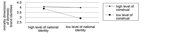 According to the ANOVA analysis, the main effect of national identity was significant, F(1, 56) = 10.23, p < 0.01, η2 = 0.154, participants with high national identity rated the domestic brand identities more favorably (M = 4.06, SD = 0.141) than participants with low national identity (M = 3.38, SD = 0.158). As predicted, the interaction of national identity and construal level on national brand identity desirability ratings was significant (F(1, 56) = 5.63, p < 0.04, η2 = 0.09) (see Figure 1). Planned contrasts revealed that participants with low level of national identity evaluate the domestic brand identities more positively when they are assigned to the high level of construal (M = 3.86, SD = 0.588) than when assigned to the low level of construal (M = 2.89, SD = 0.97), F(1, 25) = 10.53, p < 0.01, η2 = 0.296). Thus, H1 was supported. However, when with high level of national identity, participants assigned to the high level of construal (M = 4.04, SD = 0.91) and to the low level of construal (M = 4.07, SD = 0.76) perceived the same identities of the domestic brands, F(1, 31) = 0.013, p > 0.1. Thus, H2 was supported.