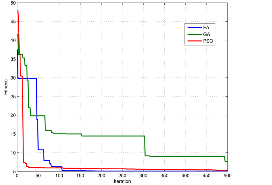 Figure 2. Convergence of FA, GA and PSO in optimizing Model I.