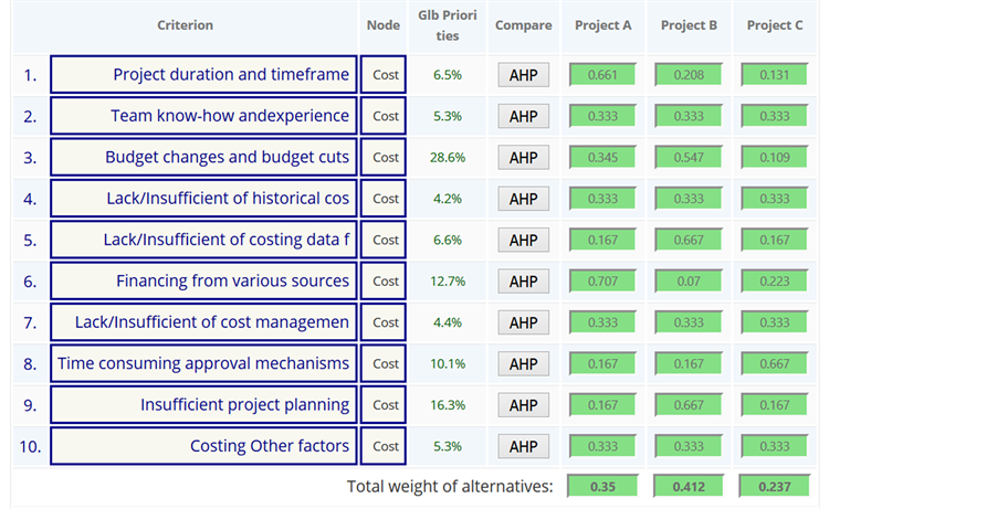 After adopting the proposed factors that were found most frequently in the literature review, this initial set of factors was evaluated using the multi-criteria decision-making method, Analytical Hierarchy Process (AHP) [16] for defining the relative weight of each factor. The application of AHP method was done by using online AHP system that facilitated the whole process (http://bpmsg.com/academic/ahp.php ).