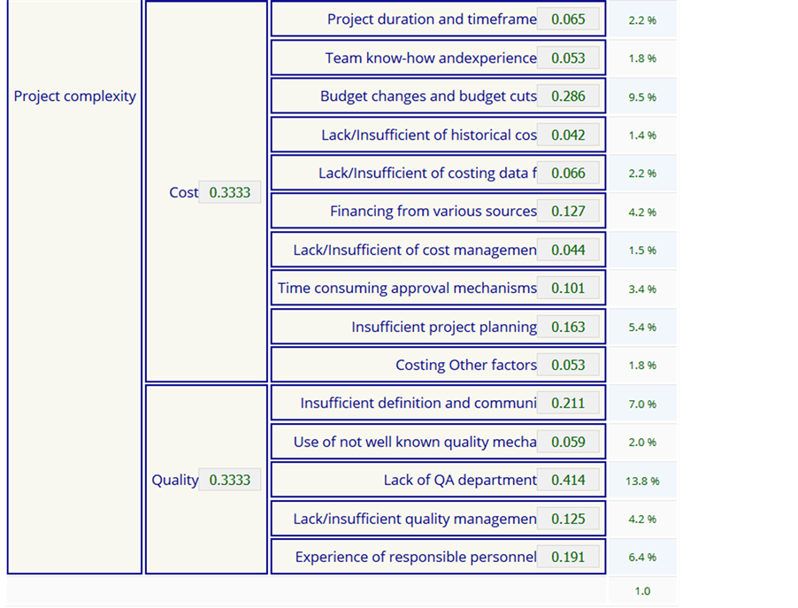 The above factors lead to the decision tree presented in Figure 3. We have done the assumption that all top level factors: cost, time and quality contribute to the complexity with the same weight, 33.33% since all factors are considered equivalent for project success.