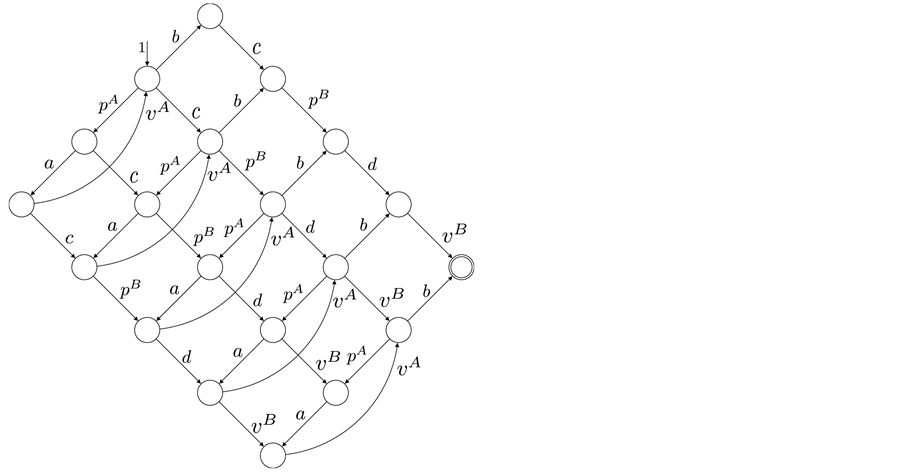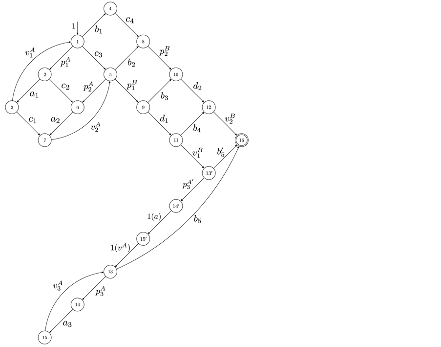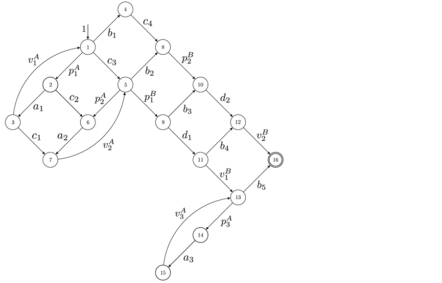 This small example includes synchronization and one single loop. We use two threads, namely A and B, sharing one single semaphore with the operations p and v. The CFGs of the two threads are depicted in Figure 1(b) and Figure 1(c). Each edge is labeled by a basic block l. Together with a RCFG of a binary semaphore, we calculate the adjacency matrix P of the corresponding RCPG in the following steps: The interleaved threads are given by