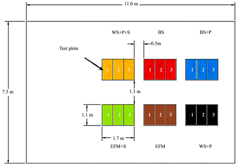 Figure 1. Experimental layout of test plots and treatments, Turf Grass Research Unit, Auburn, AL. Note: BS = Bare soil; BS + P = Bare soil with PAM; EFM = Engineered fiber matrix; EFM + S = Engineered fiber matrix with seed; WS + P = Wheat straw with PAM; WS + P + S = Wheat straw with PAM and seed.