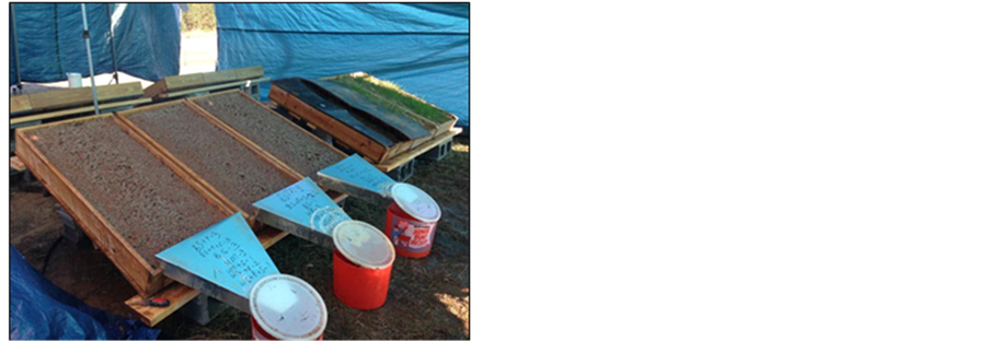 Test soils were compacted to approximate the dry bulk density of the native soil as a suitable seed bed. Typical seedbed preparation provides loose soil to match the bulk density of the native soil in numerous studies [14] . To approximate native compaction in each test plot, a core sample was taken from the soil site in Russell County. Dry bulk density of the soil at the site was determined to be 0.9 g∙cm?3. To approximate native soil density, a mold box of 25.4 cm × 25.4 cm (10 in × 10 in) was constructed and filled with native soil tamped to achieve the same dry bulk density as the original soil. The number of hand tamps required to achieve a native dry bulk density was 60. Testing and tamping of the soil was done with air dry soil, and no water was added to the soil while packing into the test plots.
