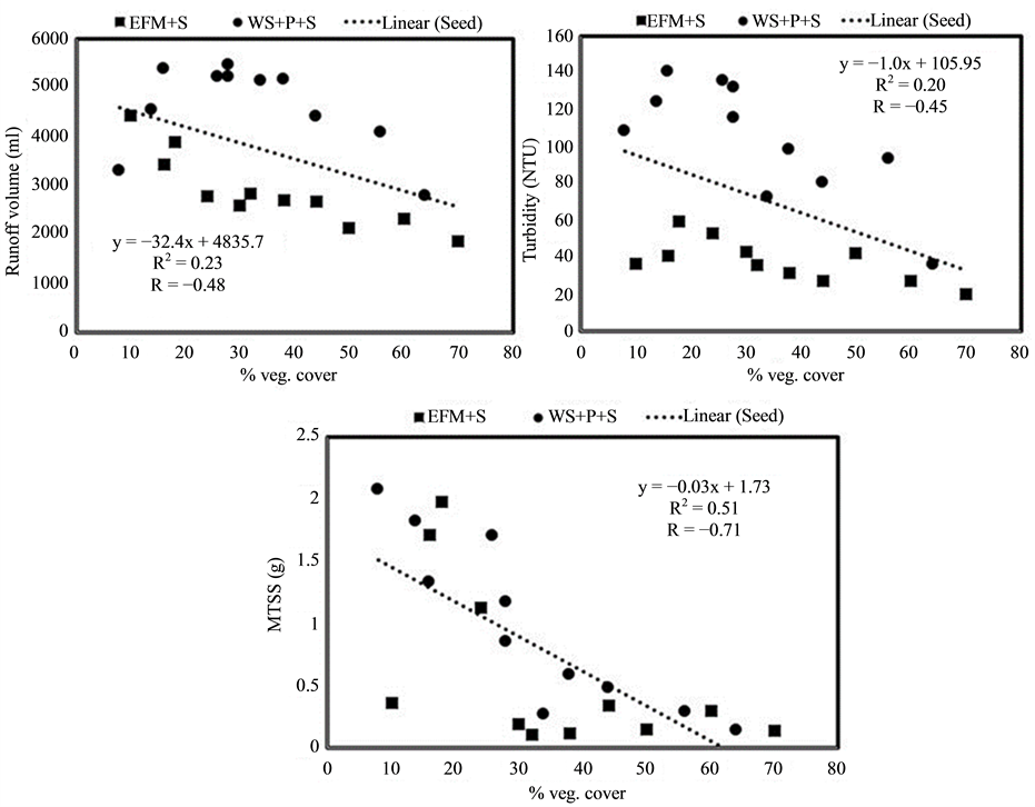 Figure 3 presents the effects of increased percent vegetation cover on plot runoff water quality and confirms a declining trend in runoff volume with increase in percent vegetation cover (r = ?0.48), as expected. Numerous studies report similar runoff reduction with increase in percent vegetation cover [32] [33] . The correlation coefficient (r = ?0.45) between turbidity of seeded treatments and percent vegetation cover indicates similar turbidity reduction with an increase in percent vegetation cover. The impact of increased percent vegetation on MTSS reduction was even more impressive (r = ?0.71), as also reported by other researchers [21] [22] due to increased surface roughness and the physical and mechanical interception of flow by vegetation.