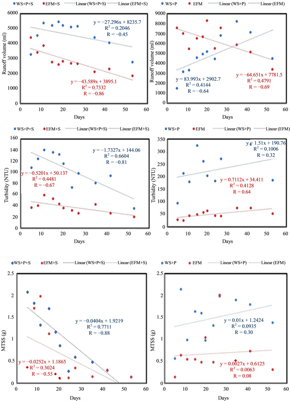 Figure 4 provide evidence of water quality benefits from seeding in conjunction with other temporary covers. The runoff volume of seeded treatments (WS + P + S and EFM + S) correlate negatively (r = ?0.45 and ?0.86, respectively) as compared to the rising response of non-seeded (WS + P) treatment (r = 0.64) over time. The vegetation intercepts rainfall, which results in lower runoff volume. The non-seeded EFM treatment performed consistently well in terms of runoff volume reduction. The correlation between seeded treatments (WS + P + S and EFM + S) and days in terms of turbidity was also negative (r = ?0.81 and ?0.67, respectively) versus a positive correlation for non-seeded treatments (r = 0.32 and 0.64 for WS + P and EFM, respectively). Root structure of the vegetation strengthens the soil, keeping sediment in place. The MTSS response of WS + P + S and EFM + S also correlated negatively having r = ?0.88 and ?0.55, respectively, with days. MTSS delivery of non-seeded treatments (WS + P and EFM) increases over time (r = 0.30 and 0.08, respectively). The vegetation helps restrict the sediment movement from one place to another, thus reducing the soil loss. Therefore, the vegetation was helpful in reducing all water quality responses over time in combination with other temporary erosion control covers.