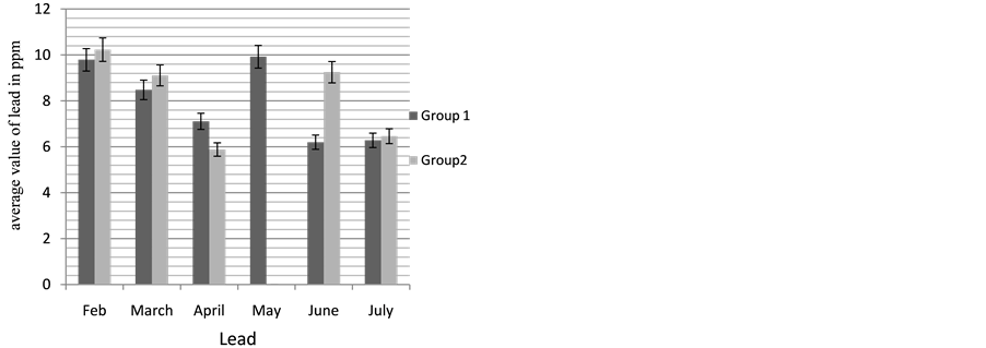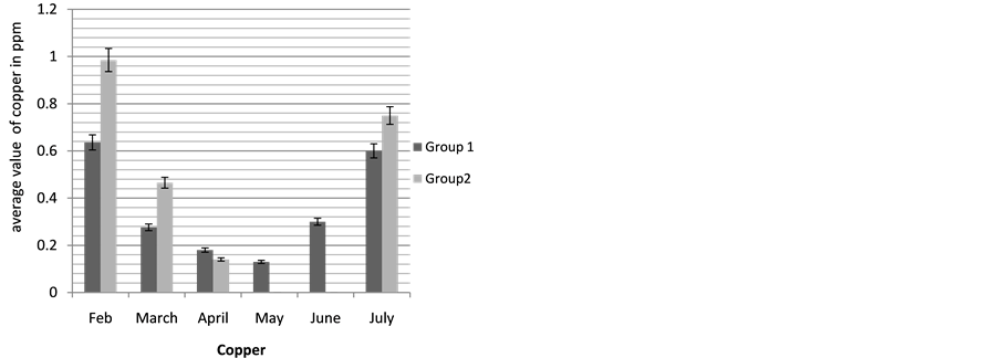 Figure 2. Variation of the average content of heavy metals. Group 1: the size of mussel “Mytilusgalloprovincialis” between 45mm and 70 mm; Group 2: the size of mussel “Mytilus galloprovincialis” between 20 mm and 44 mm.