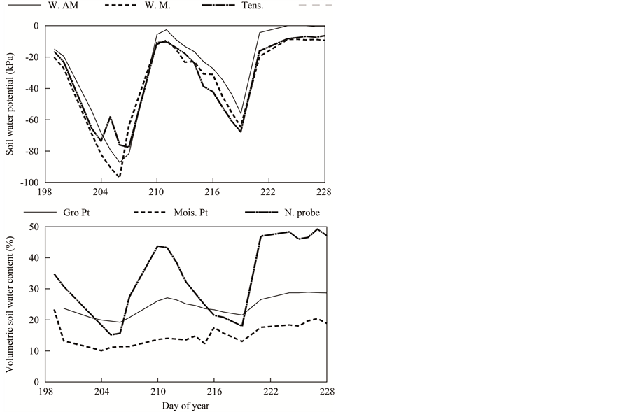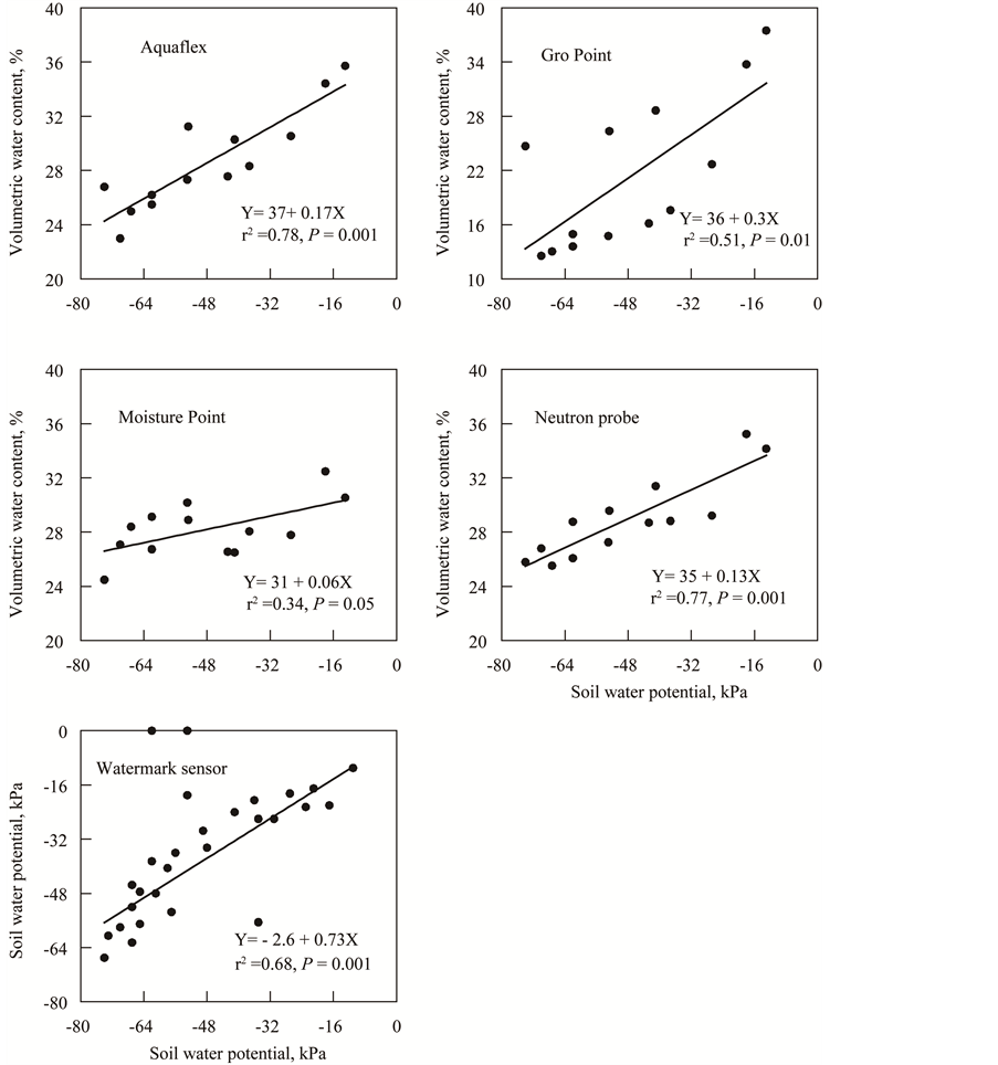 Aquaflex sensors were less responsive to the soil drying between irrigations than the neutron probe and the Gro Point sensor was more responsive than the neutron probe. The lower responsiveness of the neutron probe than the Gro Point was not surprising since the response volume of the neutron probe is larger and integrates less rapidly changing soil moisture deeper in the profile. The magnitude of the drying indicated by the Gro Point was beyond what occurred. All sensors showed correlations (r2 > 0.7) to the neutron probe (P = 0.001) and correlations (r2 > 0.5) to the tensiometer (P = 0.001 to P = 0.01) except the Moisture Point sensor (Figure 2 and Figure 3). Furthermore the Moisture Point estimates of soil water were substantially lower than the neutron probe data (Figure 2 and Figure 3).