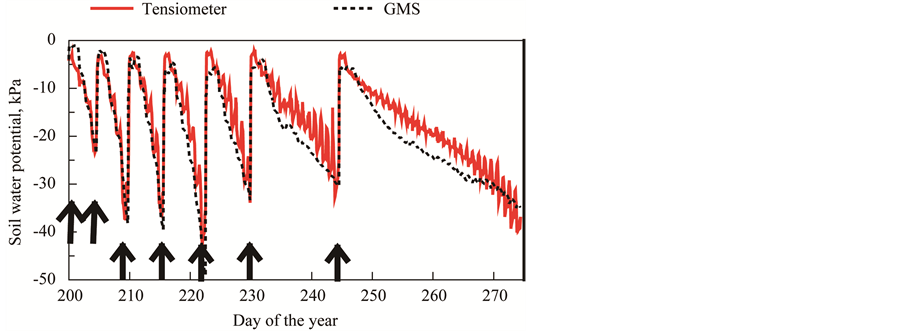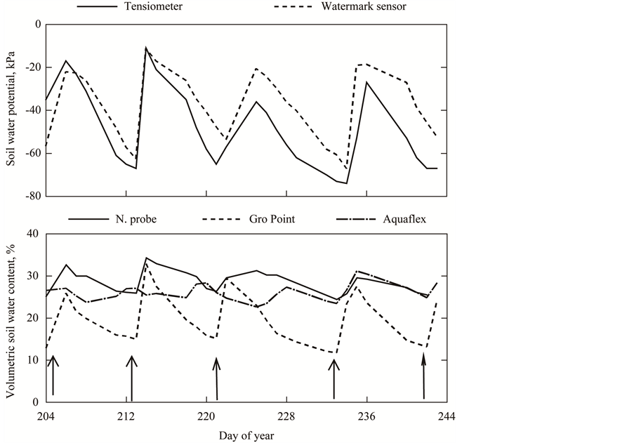 Soil moisture monitoring is a well established method to govern irrigation scheduling [1] . Application of water at a criterion wetter than crop needs results in over-application of water and a potential loss of crop yield and quality [2] [3] . Irrigation that precisely matches crop soil water requirements can avoid unnecessary water losses and can optimize yield and quality [4] -[7] .