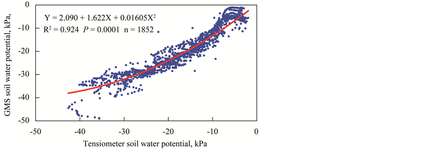 It took about 4 h for all the tensiometers and all GMS to indicate that the soil at 0.20 m had reached saturation after the onset of each furrow irrigation episode. The relative similarity in responsiveness between tensiometers with pressure transducers and granular matrix sensors (GMS) was confirmed by regression with a coefficient of determination of 0.92 (P = 0.0001) (Figure 8). The Irrigas had free air permeability close to −35 kPa for Owyhee silt loam in this trial (Figure 7).