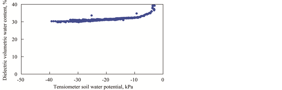 Large changes in tensiometer readings from −10 to −40 kPa translated into small changes in water content readings for the ECH2O 10 dielectric aquameter (Figure 9). A comparison of the ECH2O 10 dielectric aquameter readings with soil volumetric water content from this field indicated that the readings were relatively flat and nonlinear in response to changes in volumetric soil water content (Figure 10). The relatively small changes in volumetric soil water content measured by the ECH2O 10 dielectric aquameter were unrealistic and the small changes in measurements occurred across the critical range of soil water potential for onion irrigation decisions, limiting the usefulness of the probe. The reasons for the low responsiveness of the ECH2O 10 dielectric aquameter to the soil water content were beyond the scope of this work.